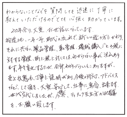 今では毎月訪問して指導していただけるので、とても助かっています。今井先生には個人的な相続対策なども相談してすっかり甘えています。今後も会社の経理だけでなく、広い範囲で指導していただけたらと思っています。これからも宜しくお願い致します。